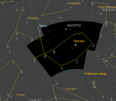 Переменная звезда ? Павлина, хорошо видная в бинокль, изменяет блеск с периодом 9 суток.
