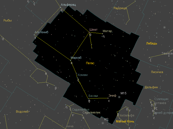 Звезда ? Пегаса Маркаб означает «седло коня», ? созвездия Пегаса Альгениб означает «крыло на боку», а ? Пегаса Шеат – «плечо коня».
