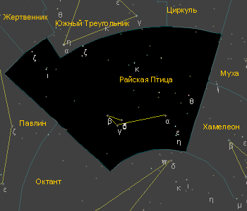 Название этого созвездия вводит астроном Иоганн Байер в 1603 году в атласе «Уранография». Созвездие получило название в эпоху великих географических открытий в честь индийской райской птицы, которую часто приносили в дар европейцам, предварительно отрезав портящие внешний вид ноги.