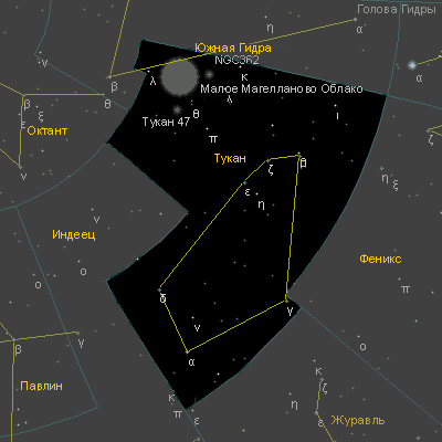 В Тукане находится один из самых интересных небесных объектов – Малое Магелланово Облако. ММО занимает на небе участок 2°, что в четыре раза превышает угловые размеры полной Луны, невооруженным глазом видна как слабое туманное облачко. Эта неправильная галактика одна из ближайших к нашей Галактике. Свет от нее идет 170 тысяч лет.