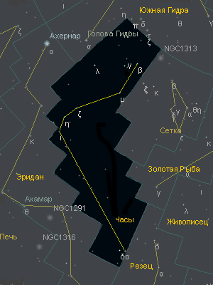 Созвездие Часы расположено недалеко от созвездия Эридан, но найти его очень трудно. Около звезды ? Часов, имеющей блеск 5,4m, обнаружена внесолнечная планета массой 2,26 МJupiter, имеющая период обращения 320,1 суток.