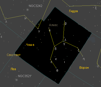Созвездие Чаши небольшое; четыре тусклые звезды, блеск которых не ярче 4m, представляют собой квадрат около туловища Гидры.