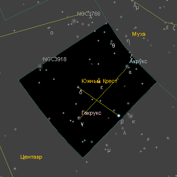Это самое известное созвездие южного неба. Четыре яркие звезды этого созвездия, ?, ?, ? и ? образуют знаменитый астеризм «Небесный крест». Хотя многие считают, что созвездие Южного Креста расположено рядом и указывает на Южный полюс мира и именно поэтому является самым известным созвездием южного неба, но это не так, созвездие расположено вдали от него. Но две крайние звезды Южного креста, ? и ?, образующие большую диагональ ромба, указывают направление на Южный полюс мира.