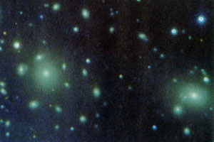 Наивысшая плотность галактик наблюдается в центральных областях крупных скоплений. Галактики здесь часто сталкиваются. Конечно, расстояния между звездами огромны, и при столкновении двух галактик звезды одной из них свободно проходят между звездами другой. Однако галактики притягивают друг друга, звезды сходят с орбит; в некоторых случаях галактики сливаются.