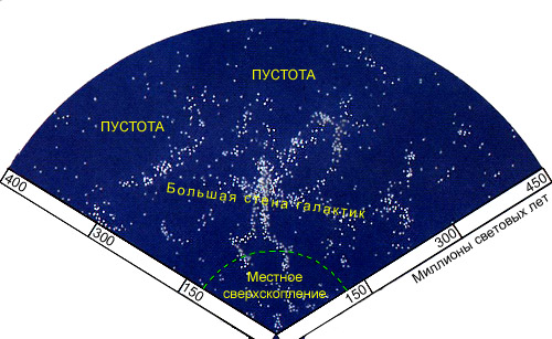 На трехмерных картах северной части неба хорошо заметна подобная структура, имеющая размеры 50?30?5 Мпк, названная Великой стеной. Похожее образование обнаружено и в южной части неба. Ячеистая структура Вселенной отражает картину распределения вещества в эпоху, когда галактик еще не существовало.