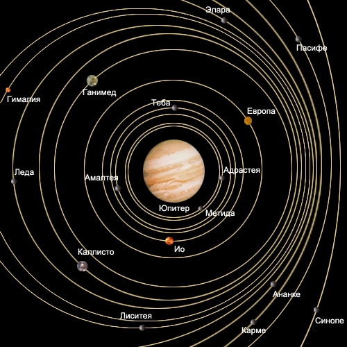 К началу третьего тысячелетия у Юпитера известно 28 спутников. Четыре из них отличаются большими размерами и массой. Они движутся почти по круговым орбитам в плоскости экватора планеты. 20 внешних спутников настолько далеки от планеты, что невидимы с ее поверхности невооруженным глазом, а Юпитер в небе самого дальнего из них выглядит меньше Луны.